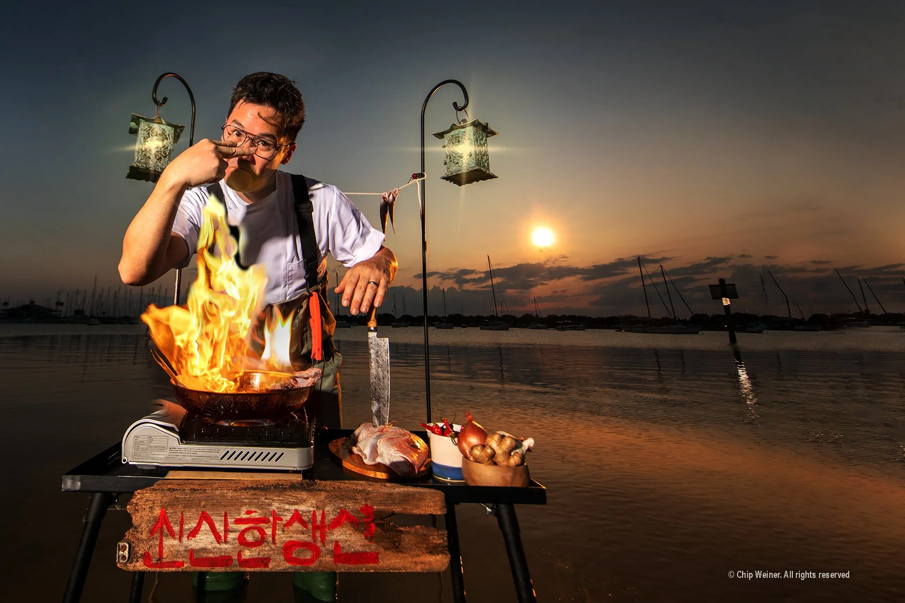 Soon after we met, he began his career in the culinary arts. When I asked around about shooting creative portraits, he came up with this idea. He envisioned himself standing in the surf, wearing full chef gear, cooking fish on an open flame. The sign (in Korean) says Fresh Catch. Allan is from Korea. I thought it was brilliant. We shifted a few things, including shooting him in more serene waters at sunset. I needed to put lights in the water, and a rough gulf shot wouldn’t work. The attitude in the shot was all his and not planned. He set the dish on fire using tequila; We had already done the smiley static shots, then he broke out with this “Look at me, bitch!” pose.
