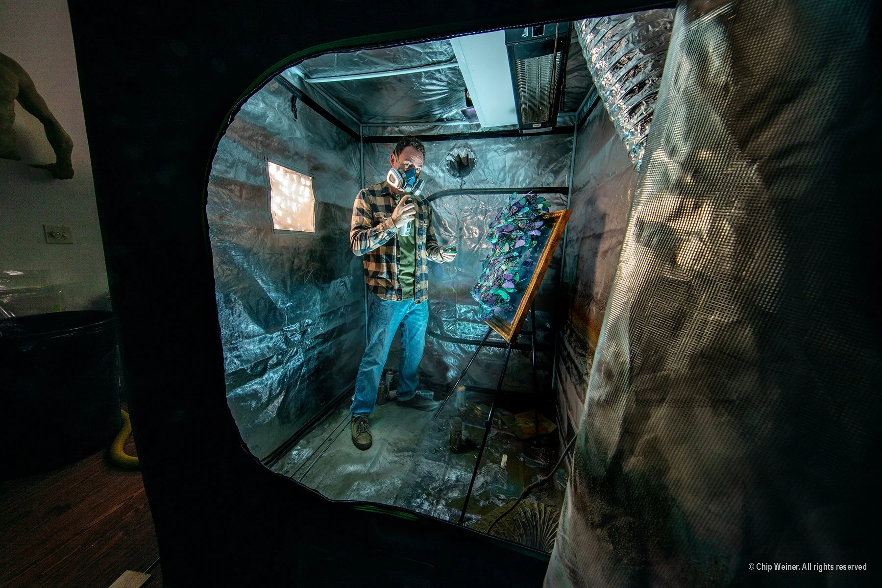I spoke to him about making a portrait and returned to scout the location. He showed me this paint booth he uses to create his work. I knew we had to get it in a shot, but I wasn’t sure how. On shoot day, he was very helpful in making the shot right and assisted in moving things around to create the perfect studio look. I can work with this kind of talent all day long! We got several shots of him in the studio that came out great. Then, we moved to this booth. The silver lining inside was reflective, and I was sure it wouldn’t take much light to make it dazzle.
