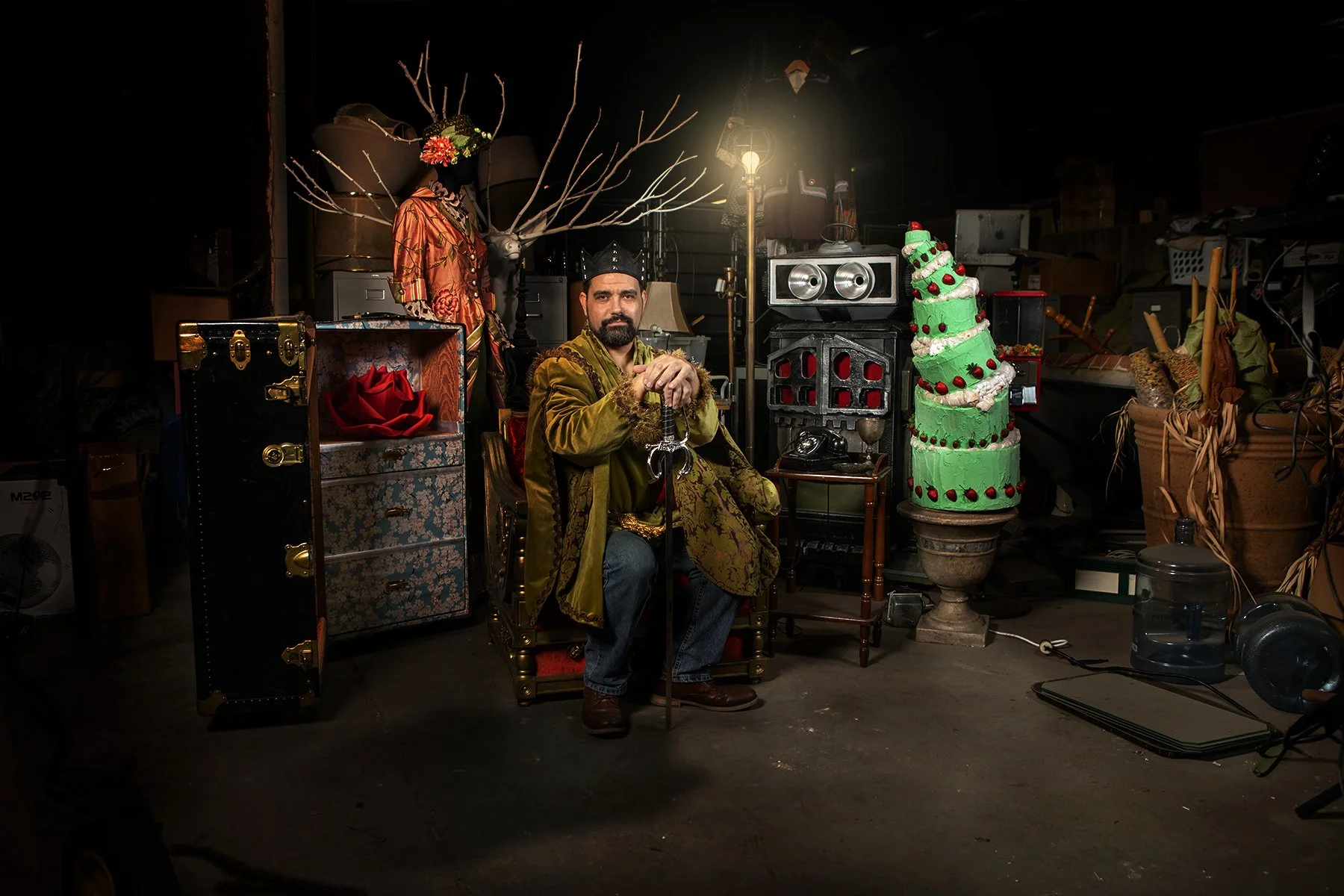 When I approached Eric about making a portrait, I wondered how we could put his history in the photograph. Then, he invited me to the theater's props warehouse, where I immediately got lost in all of the magnificent contents. Along with hundreds of props and costumes, there was a beat-up light stand with a cage on it, and I asked him about it. He told me the origin and importance of a ghost light in theaters. Briefly, it has some practicality, but it has more to do with strong superstition in theater circles. I made it a key element in his photo and dressed him up as theater royalty. Eric is very modest for a performer but is a kingly sport about donning the robe and crown.