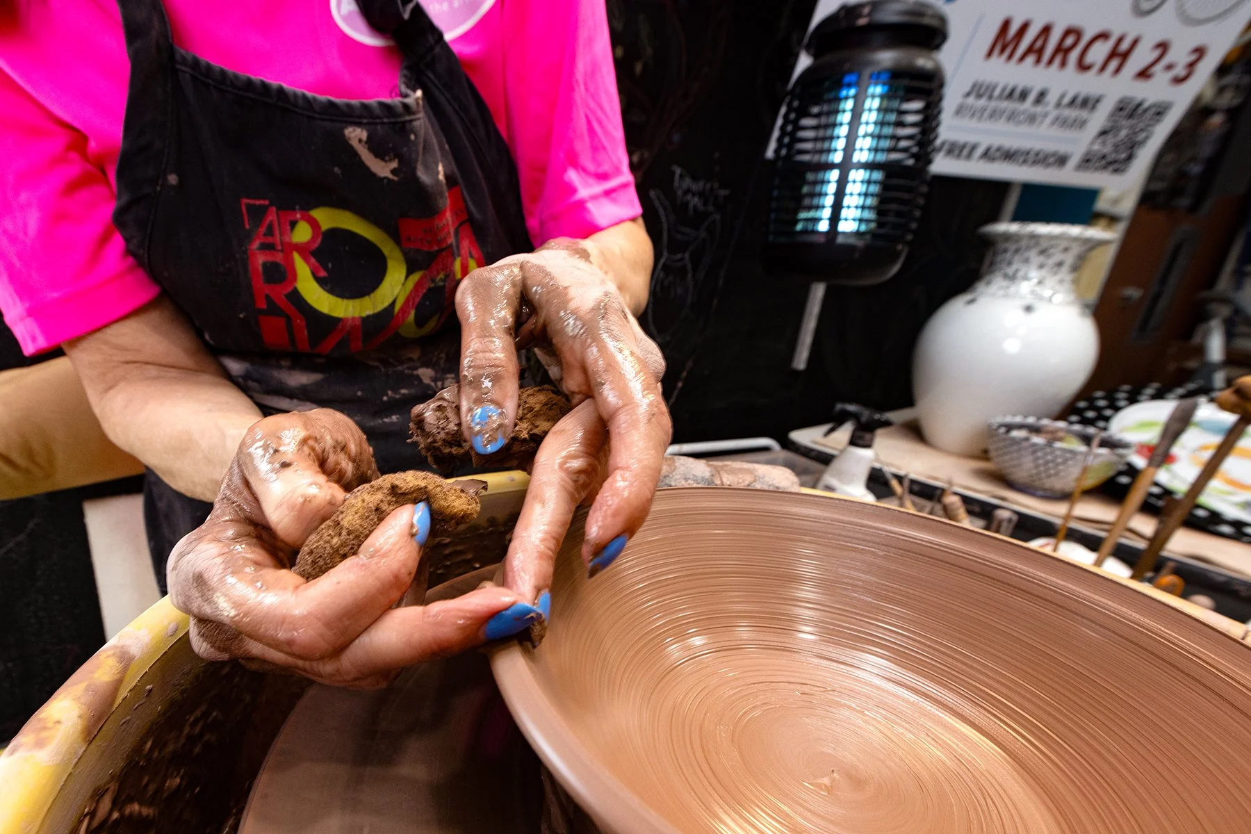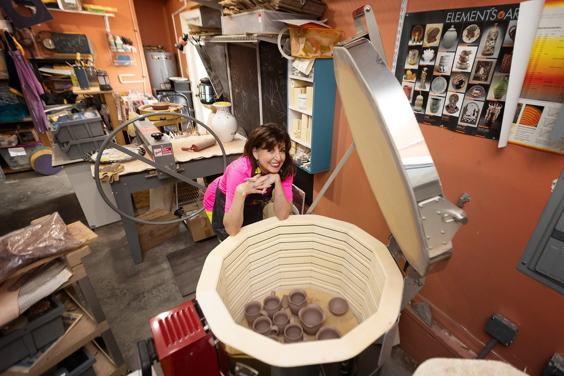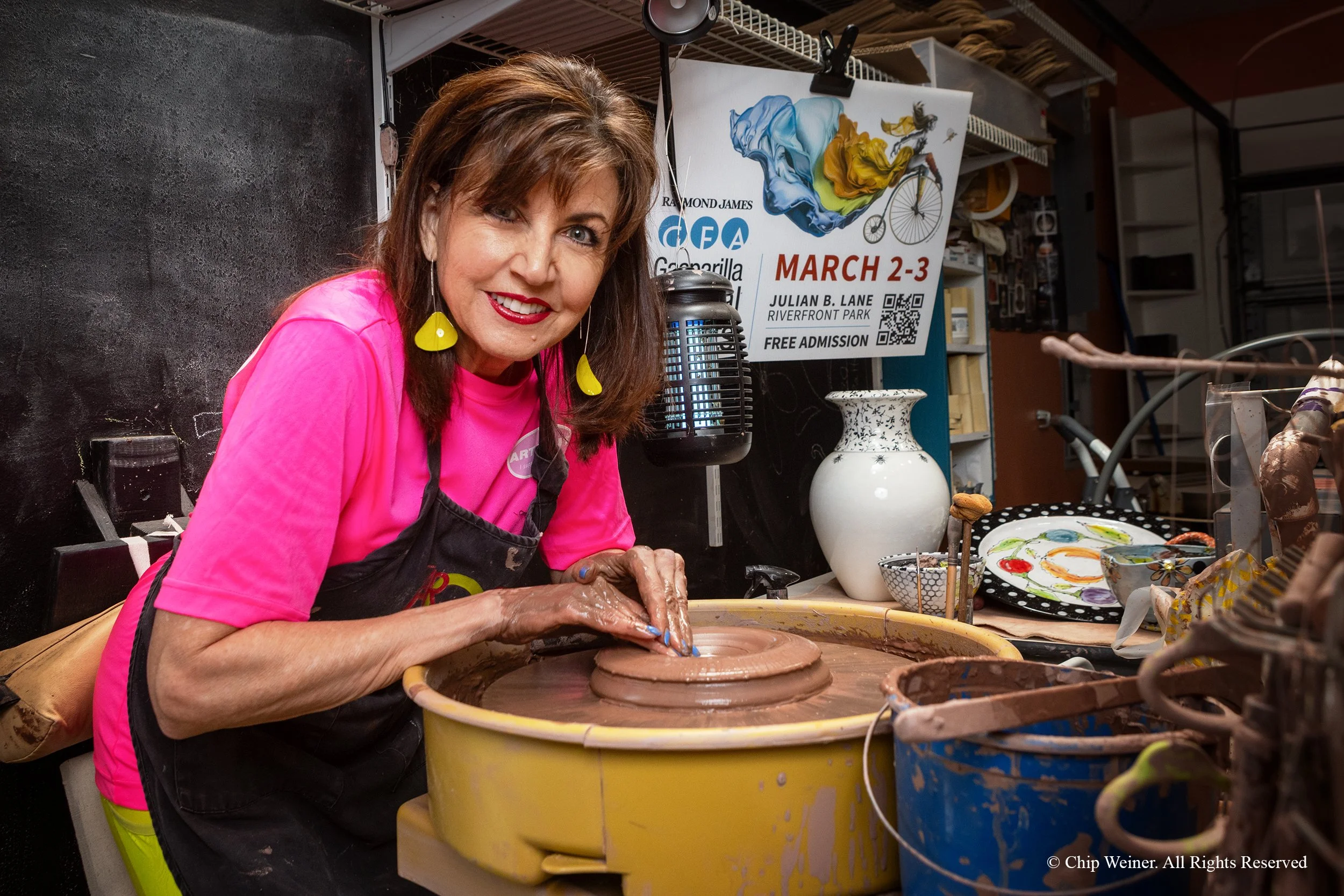 My thoughts for her portrait were about capturing the “Kimness” I grew to appreciate. Her mother was a local fashion illustrator for department stores, and Kim seems to have adopted her mother's sense of style and adapted her look. She always appears fashionable! So, I wanted to juxtapose her Vogue look with the grit and mud of turning pottery. It worked. On shoot day, her hair was coiffed, and her stylish yellow dangling earrings were a wonderful contrast to her bright fuscia shirt. Looking through her signature red-framed glasses, she got to work. Her sky-blue fingernails popped out of the gooey brown clay as she molded it into her next creation, and the resulting photos were stellar.