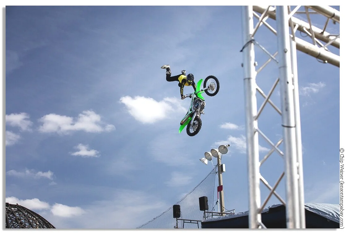 The most stunning part of the afternoon is Johnny Rockett’s Cycle Circus, where BMX bicycle riders mix with motor bikes, acrobats, and aerial gizmos to bring the audience to a thunderous roar. Motorcycle riders understand the difficulty of putting 3 bikes inside a 10 foot steel sphere racing around in 360° at high speeds (see video). The crowd goes wild. Motorcycle daredevils speeding up ramps to fly through the air in another act is a bike show staple, but it is still thrilling to see.