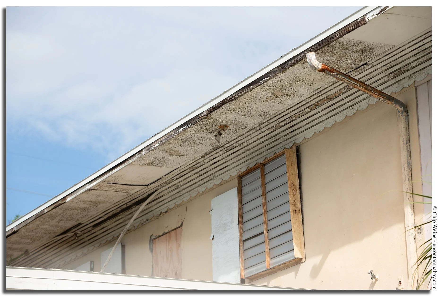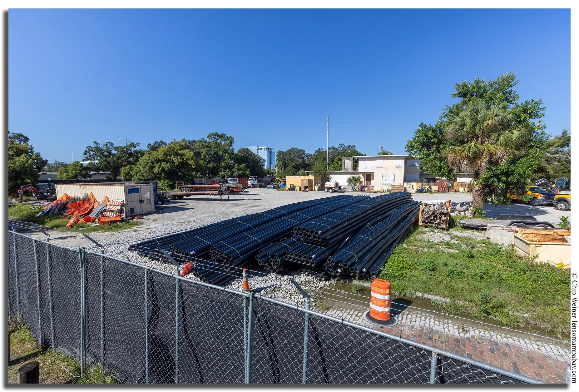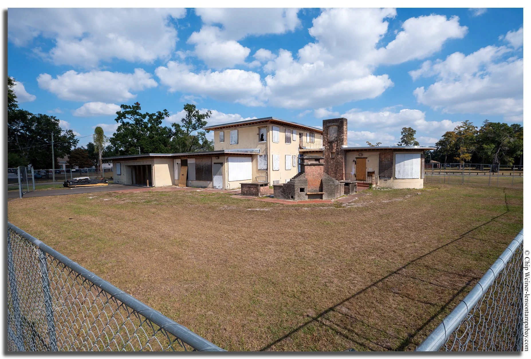 George Guida House 2025. There’s good and bad news for the home that once belonged to Mr. West Tampa. The good news for the structure now owned by the city is that all of the construction equipment and debris have been removed, and the perimeter fence has been taken down. Since 2022, the city has been using the historic property as a staging area for a neighborhood wastewater construction project. The heart-shaped driveway, installed initially by Guida for his wife, has been re-paved, and the rotted joists supporting the roof and fascia have been replaced (but remain unpainted). The house, constructed in 1952, was placed on the Local Historic Designation list in 2005 and the National Register in 2006.