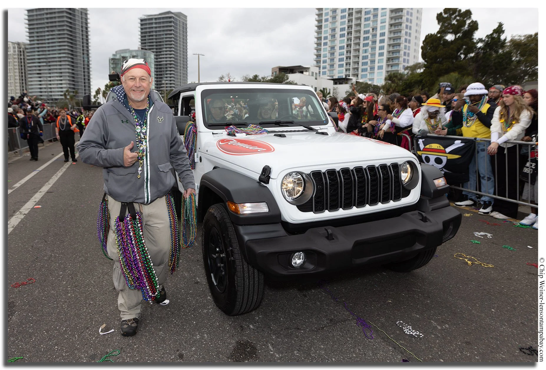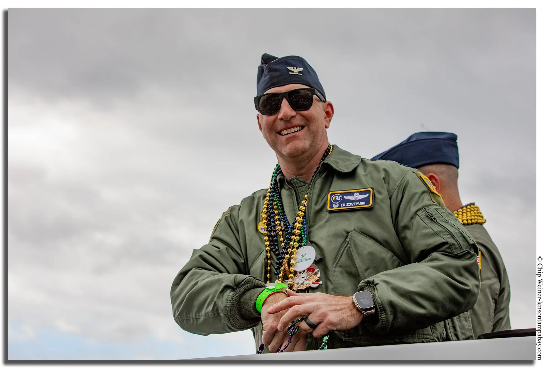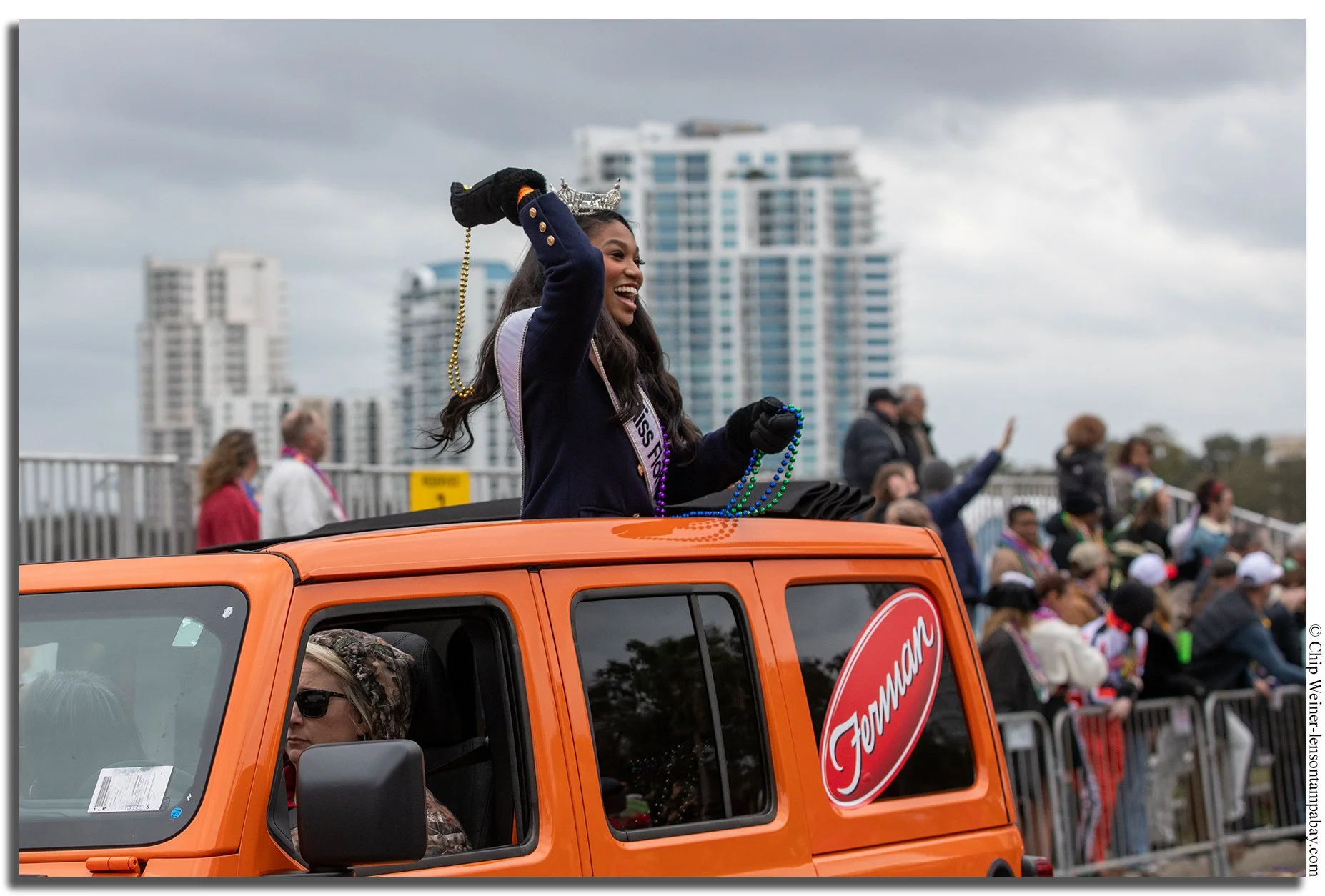 Cold fingers didn’t slow the party much. If anything, the blustery chill seemed to raise the energy, turning Bayshore into a roaring, rum-soaked endurance test that only made the celebration come more alive. The standard dignitaries were there, including Mayor Jane Castor, who, after seven years, has her bead-throwing technique down to a science. Former Tampa Bay Lightning forward Pat Maroon was the Grand Marshall. Other VIPs included state politicians, Col. Edward Szczepanik, Commander, 6th Air Refueling Wing- MacDill AFB, and the royal court of the Krewes of Gasparilla and Sant’ Yago. Beauty Queens also rode the route. Miss Tampa Alexandra (Alex) de Roos appeared on the JC Newman Cigar float, and Miss Florida Paris Richardson popped out of the top of the Jeep, trading the traditional parade wave for throwing strings of beads.