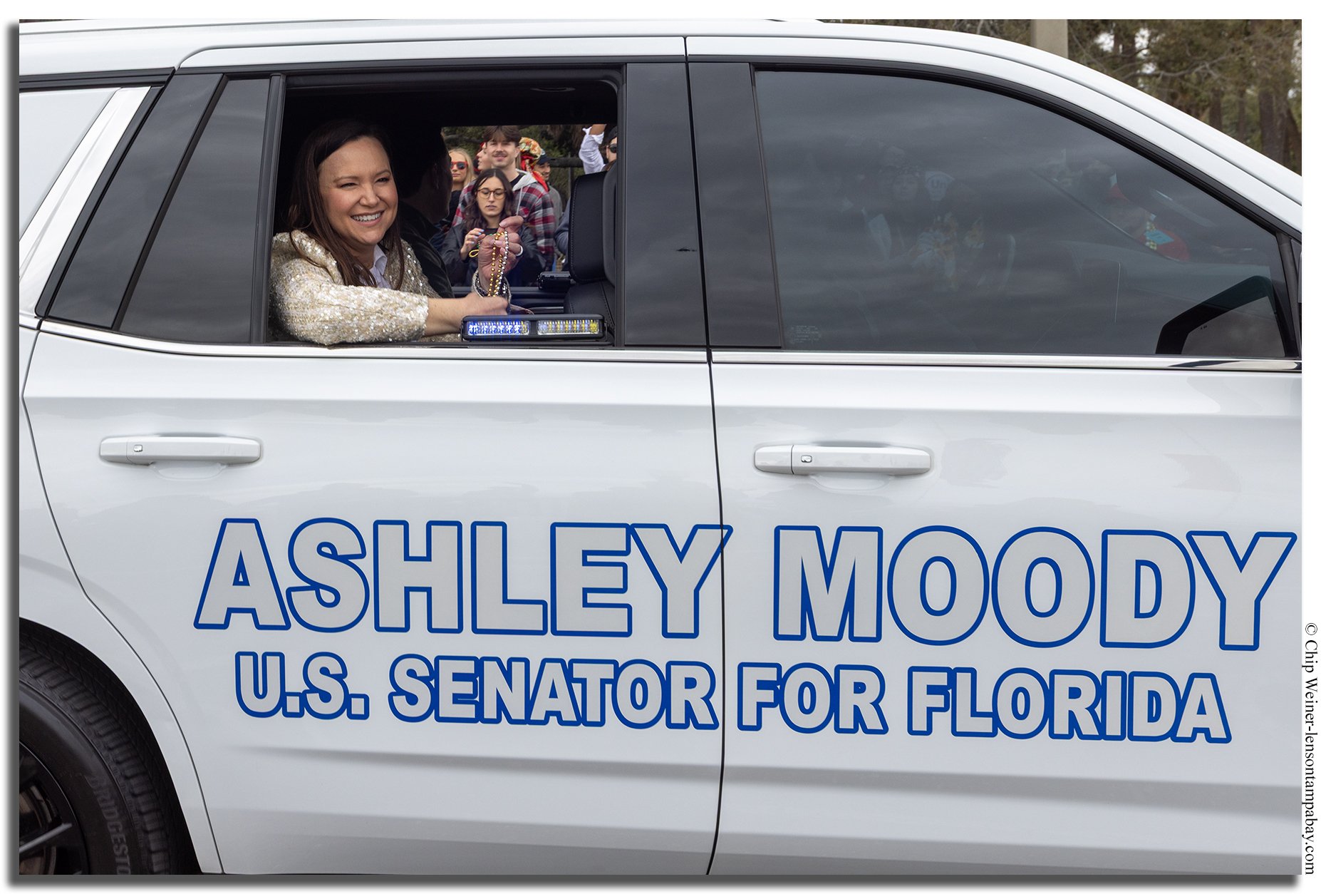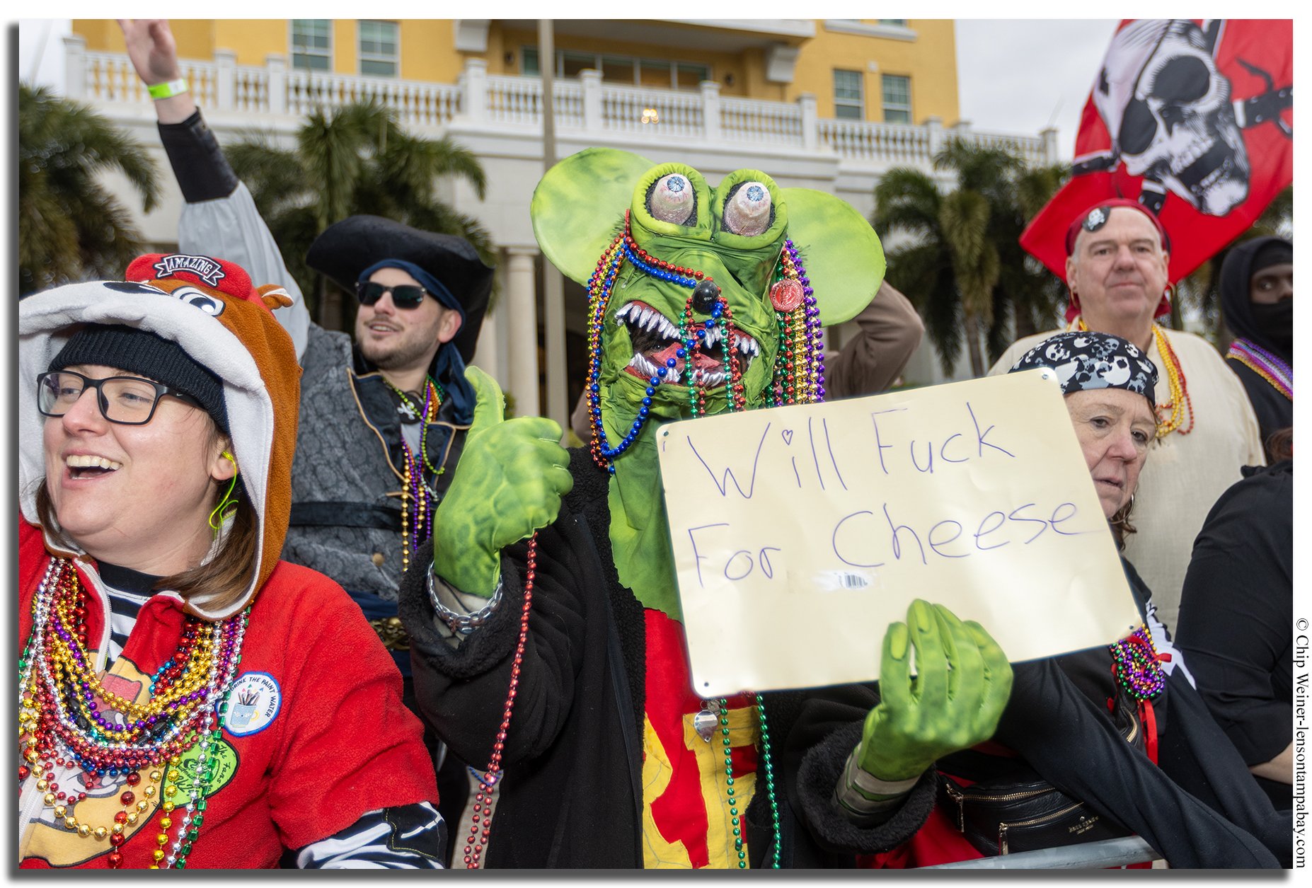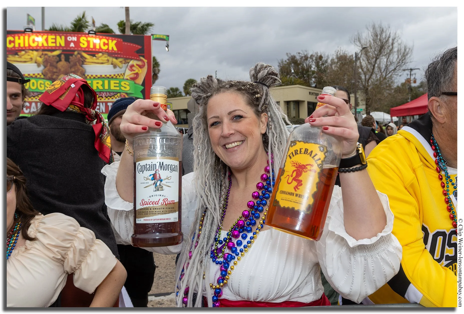Cold fingers didn’t slow the party much. If anything, the blustery chill seemed to raise the energy, turning Bayshore into a roaring, rum-soaked endurance test that only made the celebration come more alive. The standard dignitaries were there, including Mayor Jane Castor, who, after seven years, has her bead-throwing technique down to a science. Former Tampa Bay Lightning forward Pat Maroon was the Grand Marshall. Other VIPs included state politicians, Col. Edward Szczepanik, Commander, 6th Air Refueling Wing- MacDill AFB, and the royal court of the Krewes of Gasparilla and Sant’ Yago. Beauty Queens also rode the route. Miss Tampa Alexandra (Alex) de Roos appeared on the JC Newman Cigar float, and Miss Florida Paris Richardson popped out of the top of the Jeep, trading the traditional parade wave for throwing strings of beads.