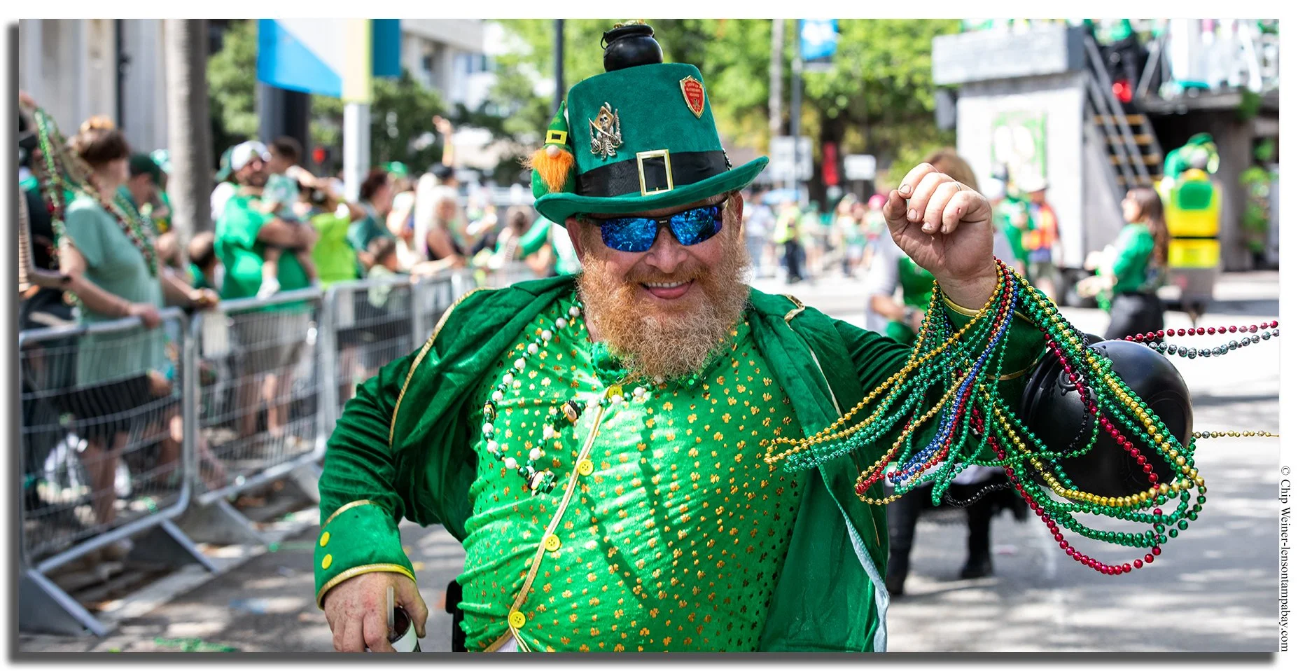 It’s tall hats, green shirts, and a party attitude throughout the parade route