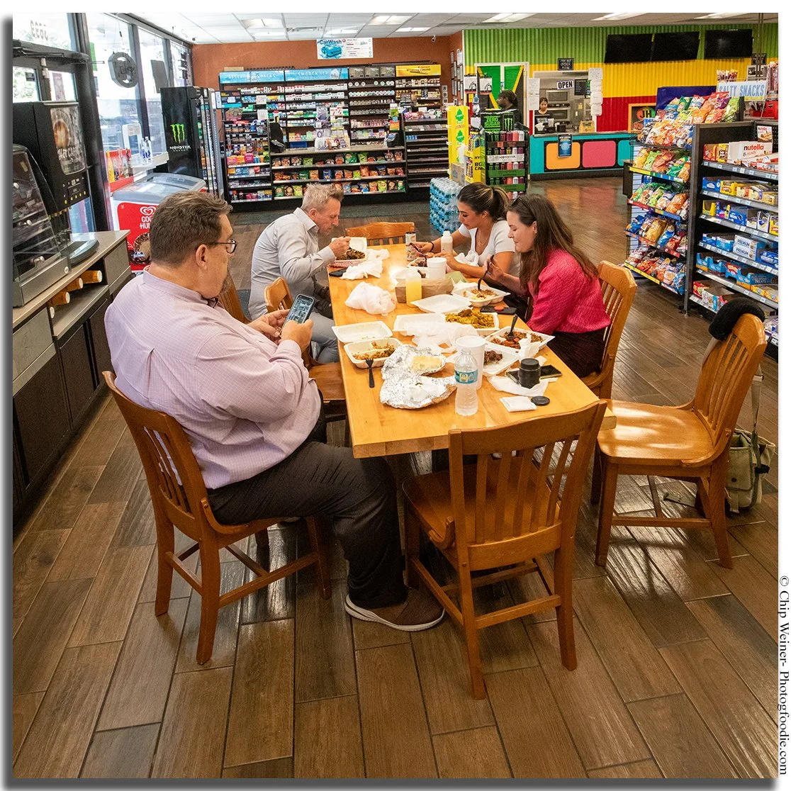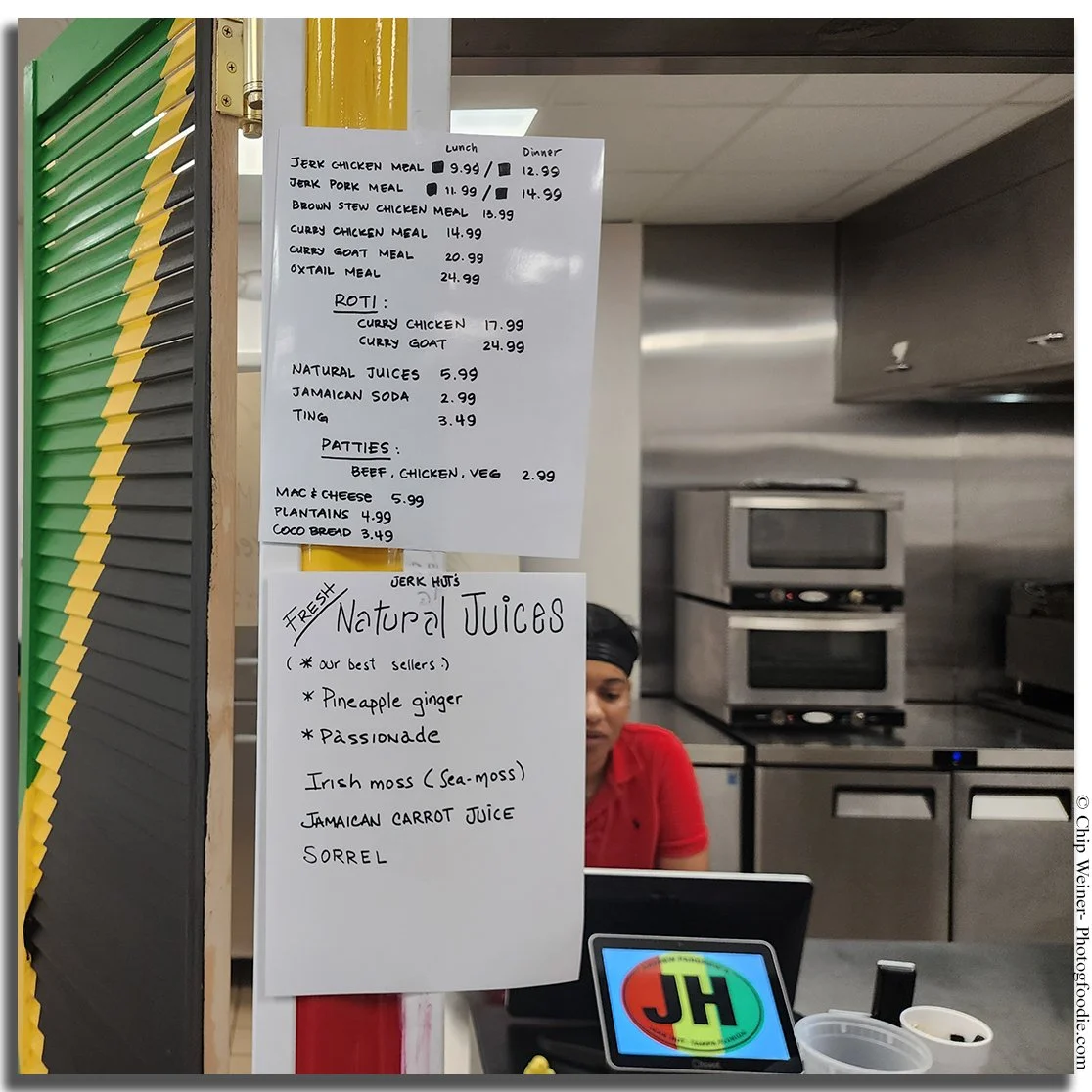 Jerk Hut has four locations. Two of them are restaurants, and two of them are quick service “express” sites, like this one at the Mobil station, which serves a limited menu. However, there is a community table here where we were able to share and meet Tim, a delightful food adventurer as well.