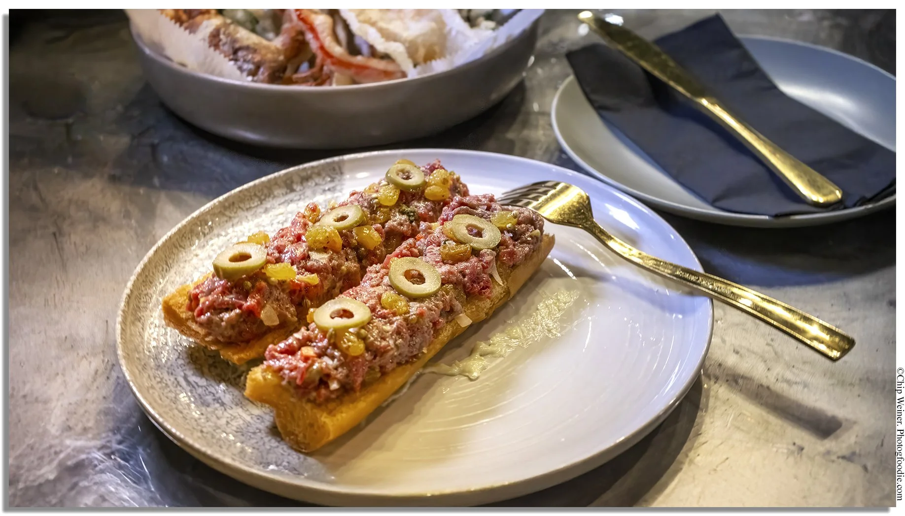 Picadillo Tar Tar - Grass-fed beef tartare on fried Cuban bread with golden raisins, mostarda, smoked olives, and sofrito.