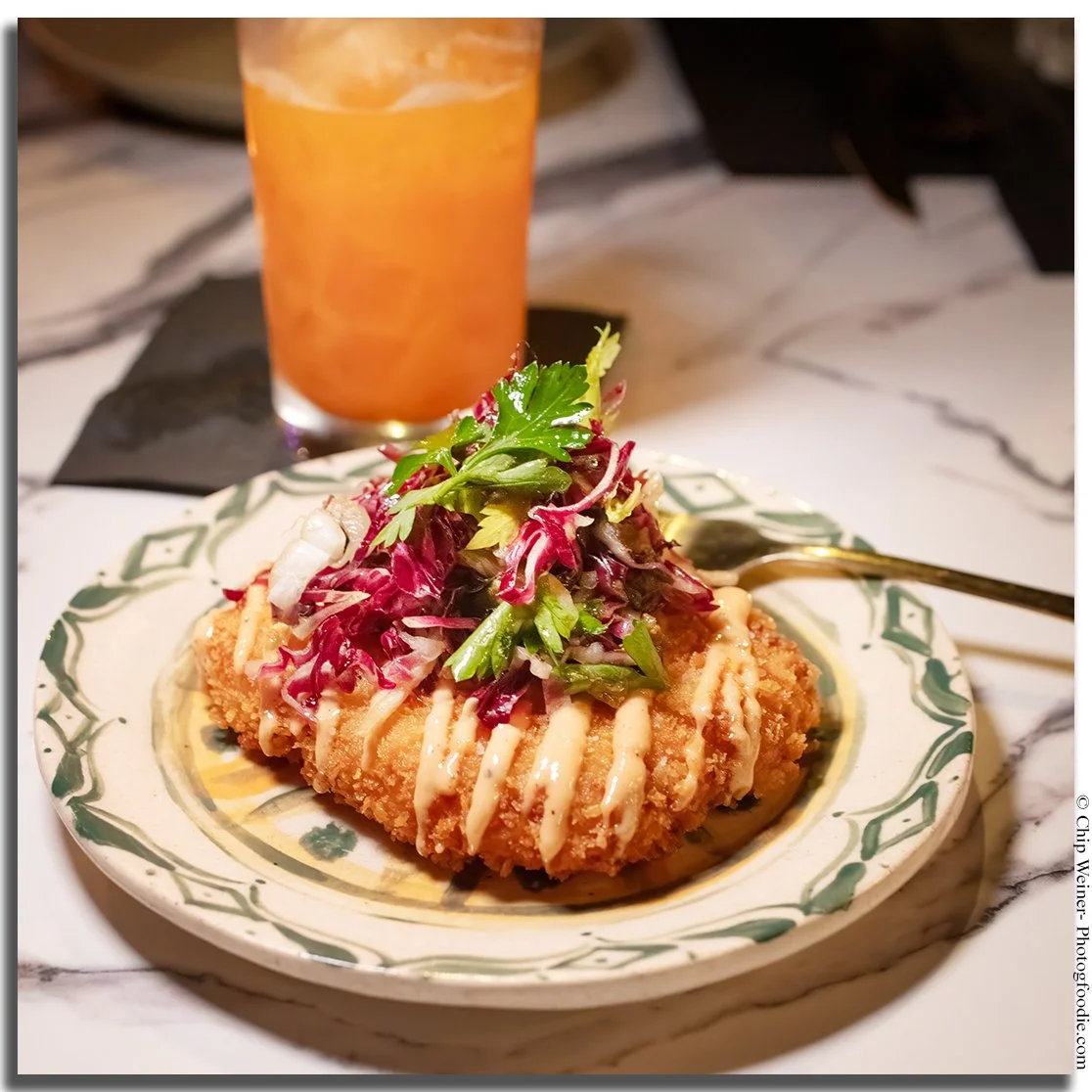 A pillowy-crisp fried square stuffed with potato-y filling mixed with ham and cheese, topped with Rosada and salsa verde.