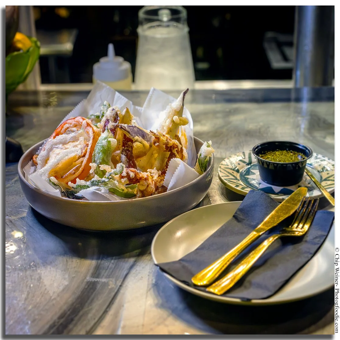 Asian Market Frito Misto ($25) Tempura fried soft shell crab with Shrimp chips, perilla, yam, eggplant with Jeow Som sauce on the side.
