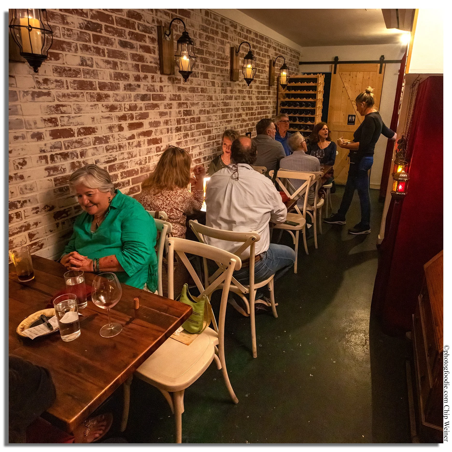The Calida Kitchen & Wine back dining room is narrow and cozy, offering guests a warm and intimate place to dine in St. Petersburg.