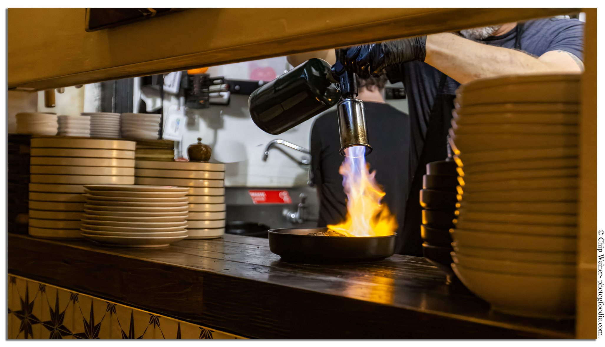 It’s cozy. There are typically around 22 seats available on any given night, though they have the ability to stretch a bit for larger parties. The kitchen in the back is tiny. The pass, which doubles as prep space, is about the size of a typical fireplace mantle. From the dining room, you can watch Chef Ian flame finishing touches with one of the four torches he keeps holstered back there.