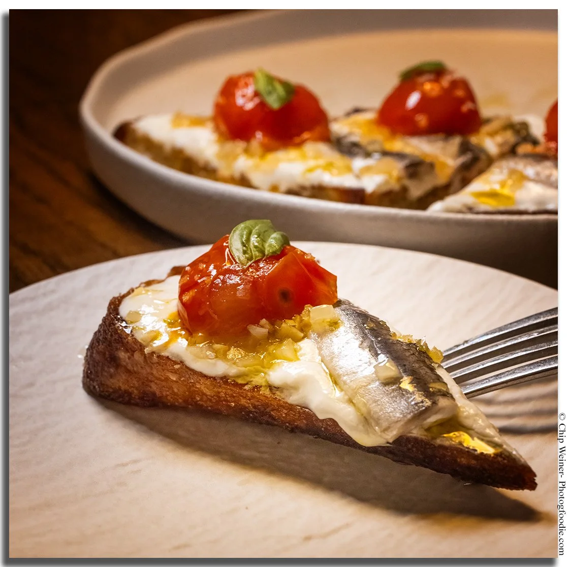 Crostini- pickled anchovy, Stracciatella, marinated tomato.